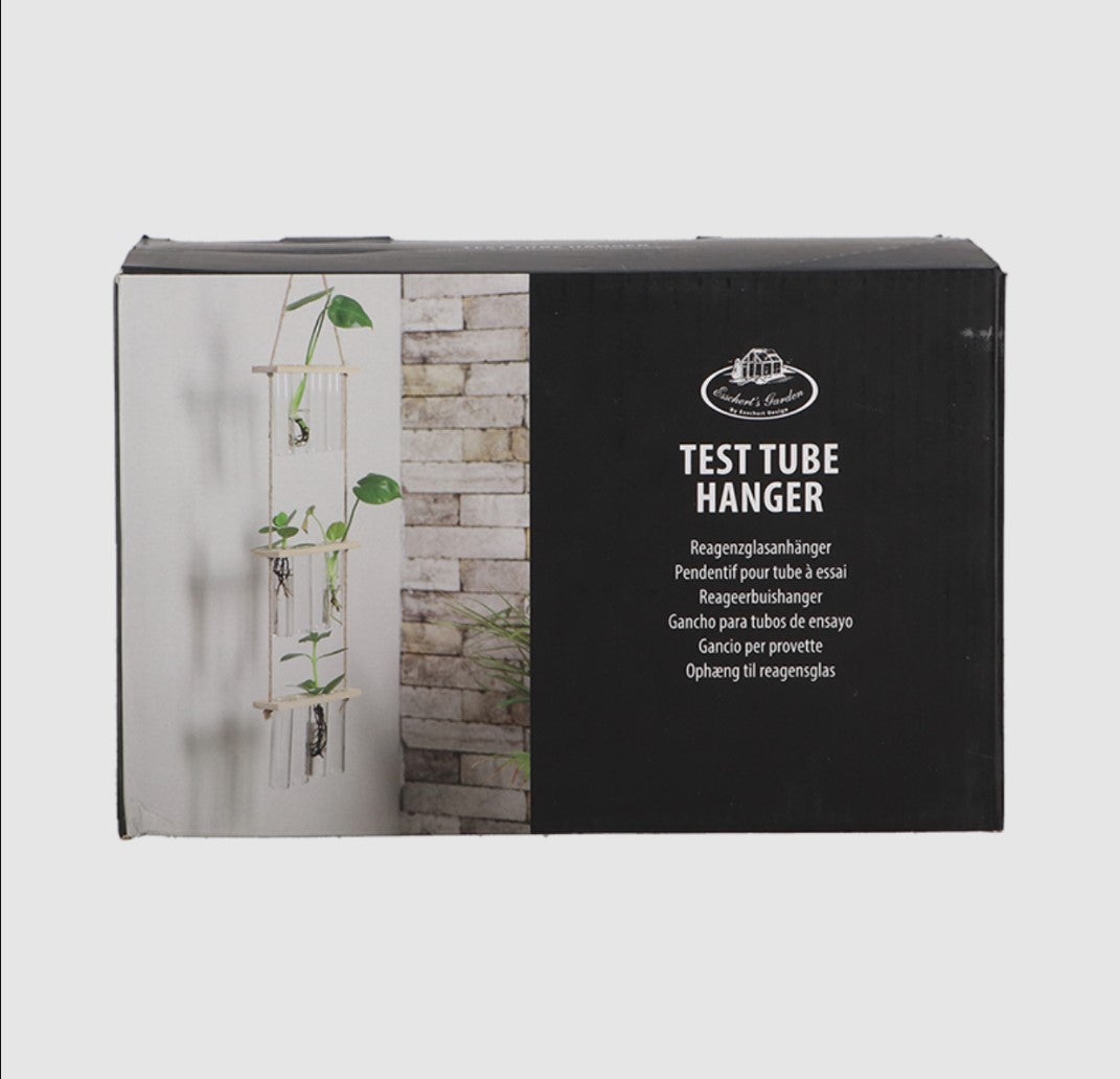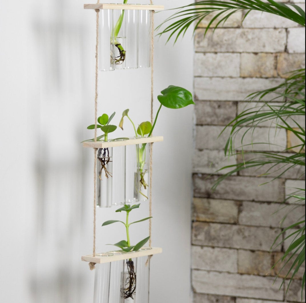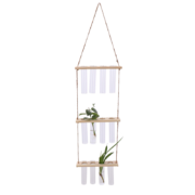 Riippumaan ripustettava koeputkiteline jossa 3 kerrosta lasisia koeputkia puisessa kehikossa.