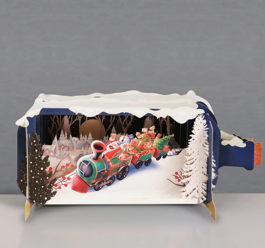 Pullopostia joulu 3D Pop up -kortti Joulupukki hurjastelee junalla