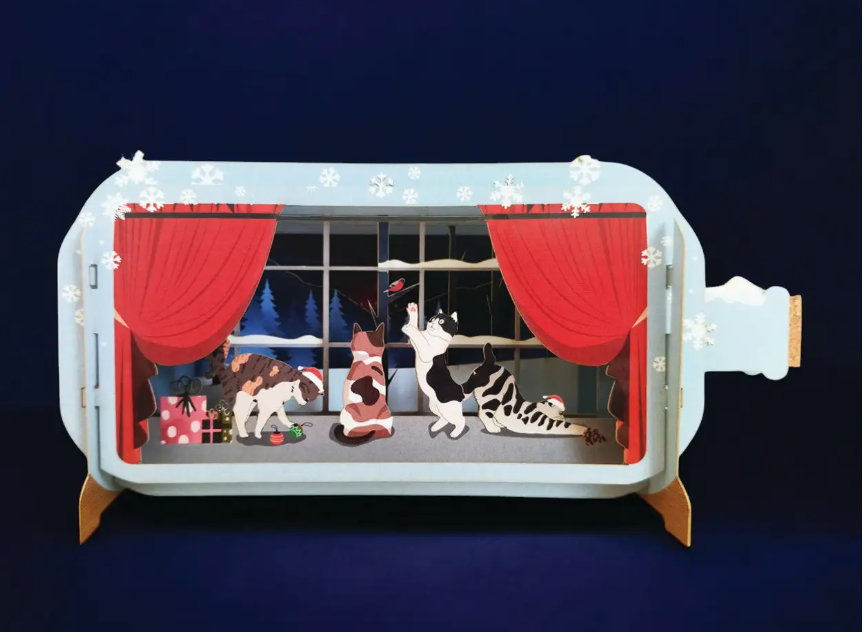 Pullopostia joulu 3D Pop up -kortti joulukissat ikkunalla