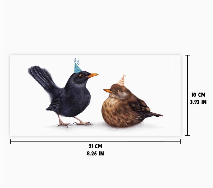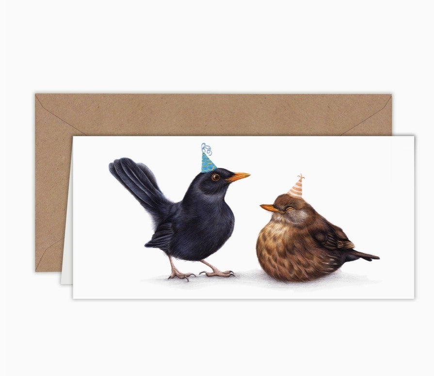 Kaksiosainen kortti jossa mustarastaas onnittelee ystäväänsä.