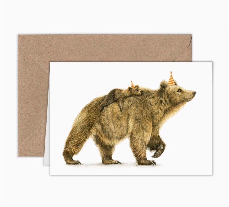 Kaksiosainen kortti jossa suloinen kuva karhusta poikasensa kanssa. Ovatkohan nämä karhut menossa juhliin, kun on niin hienot hatut päässä ja muikeat ilmeet?
