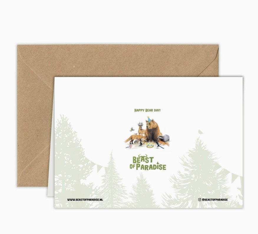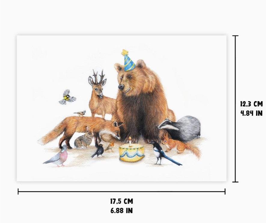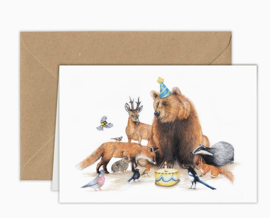 Kaksiosainen kortti jossa metsäneläimet ovat juhlissa.